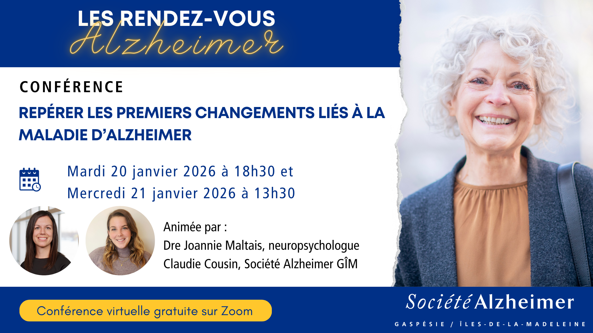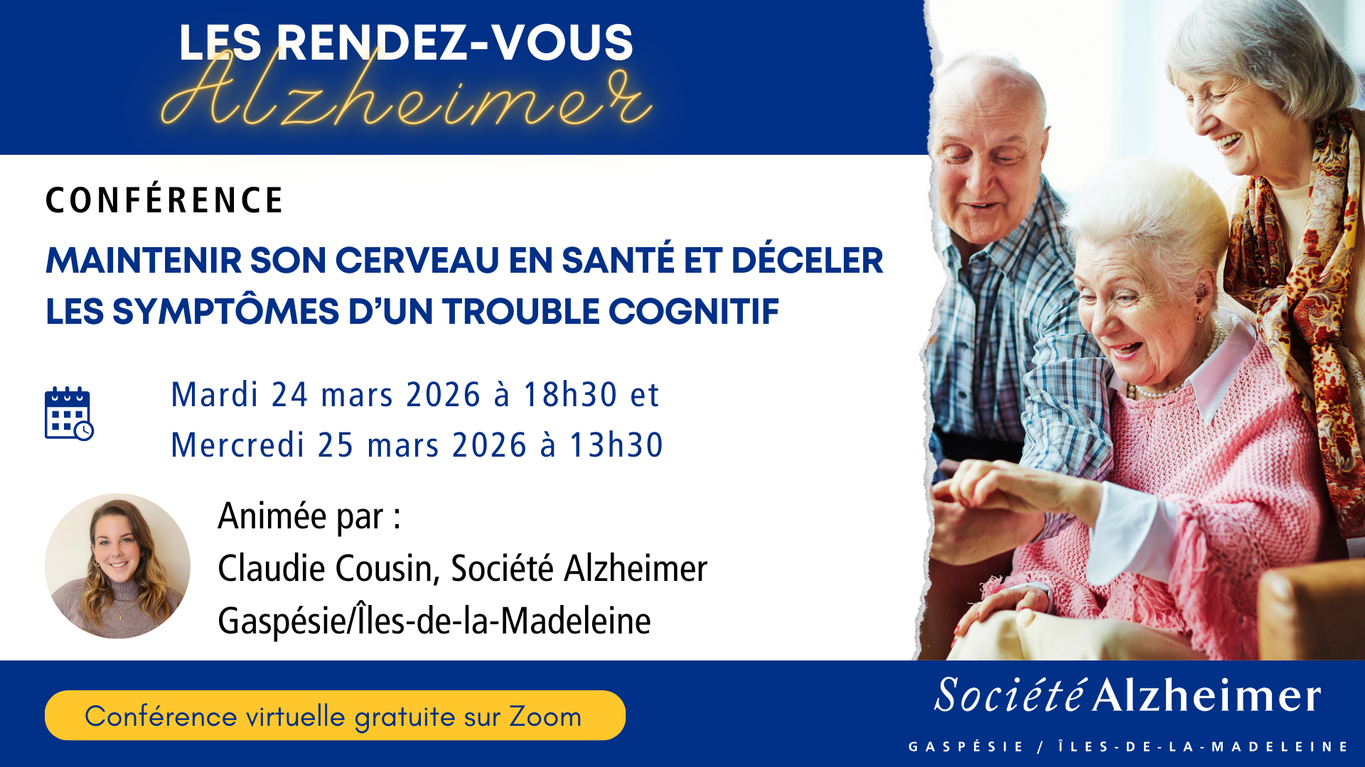 La conférence, animée par Claudie Cousin de la Société Alzheimer Gaspésie/Îles-de-la-Madeleine, sera présentée deux fois. Inscrivez-vous dès maintenant. La conférence est gratuite, mais l’inscription est obligatoire pour recevoir votre lien Zoom.